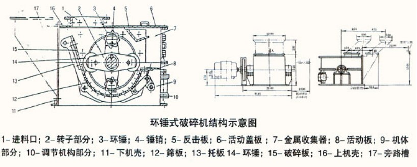PCH系列環(huán)錘式破碎機是一種帶有環(huán)錘的沖擊轉子式破碎機,物料進入破碎機后,首先受到隨轉子高速旋轉的環(huán)錘的沖擊作用而破碎,被破碎的物料同時從環(huán)錘處獲得動能,高速度地沖向破碎板。然后落到篩板上,受到環(huán)錘的剪切、擠壓、研磨以及物料與物料之間的相互作用進一步破碎,并透過篩孔排出。不能破碎的雜物則進入金屬收集器,定期清除。