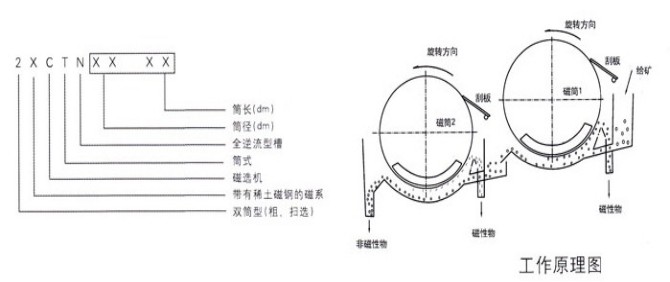 該類設(shè)備利用永磁磁系所產(chǎn)生的磁力,將礦漿中的磁性礦物吸收引到圓筒表面上來,并隨著圓筒一起旋轉(zhuǎn),待脫離磁場(chǎng)作用后在重力、(刮板)作用下,排出機(jī)外,而非磁性物料從尾礦口排除,完成分選作用。